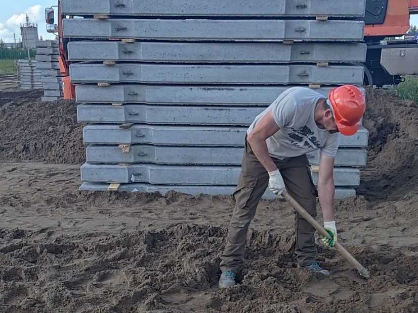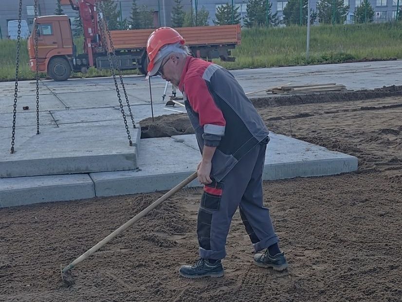 Устройство щебеночно-песчаного основания: укладка геотекстиля, послойная отсыпка песком и щебнем с трамбовкой.